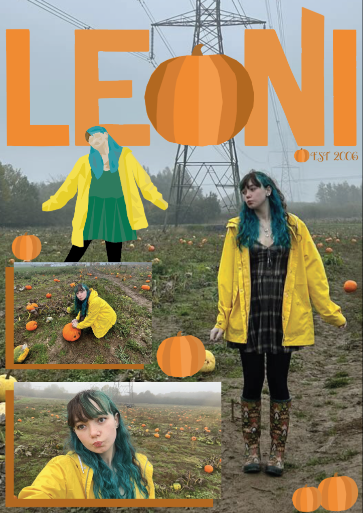 This self-promotional image poster is intended to highlight my love for autumn and Halloween. The pictures used of me are taken at a local pumpkin patch which I visited to get a pumpkin. The font which I used for my name I did in a variety of shades of orange and I replaced the ‘o’ with a pumpkin which I drew on illustrator. The colour of orange is to emphasise autumn and Halloween but also it suggests, “confidence, success, warmth, fun and energy” (Snap print solutions, 2022) and this is exactly what I wanted to capture in my poster in order to promote myself. I decided to incorporate the same pumpkin throughout the poster to make it feel more like a pumpkin patch which of course has many pumpkins. I used illustrator to draw myself also, and I added that above one of my images and I think the shadows and highlights of this drawing makes it clear it is a representation of me.