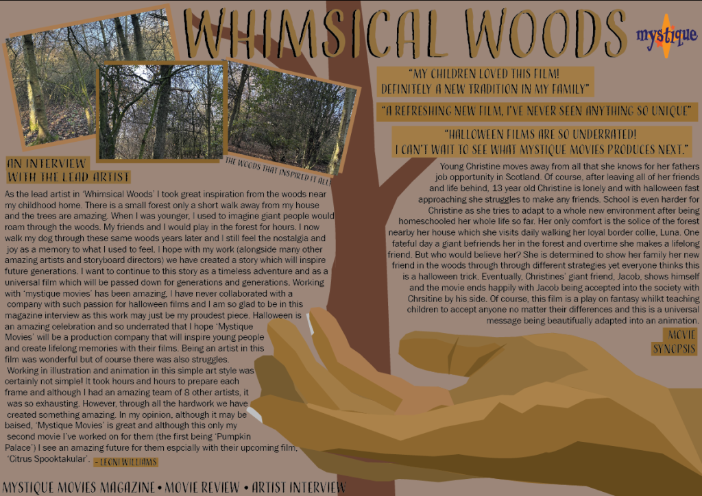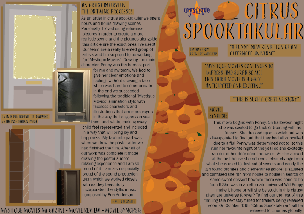 My editorial pages are pages from a magazine. These spreads are all created each based on one of the movie posters. “Readers are interested in what people have to say: their experiences, their feelings, their story” (S.Tarakson 2013). I decided to use an interview for a part of the writing within the content page spreads to interest the people that read it and give it more of an emotional, human feel so that it was more relatable. I also made it child friendly as I was aiming this content towards families and children. “Text messages, magazines, websites and emails have been found to be the most common reading choices for young people.” (Department for Education, 2012) I decided to create a magazine as they are most likely to be read by a younger demographic which are my target audience. I further aimed my content at this demographic through drawing pictures in the magazine to make it aesthetically pleasing and enjoyable to read. Furthermore, magazines are educational and it is important to be a positive impact as a brand. All three editions utilise the ‘Mystique’ logo in order to build a brand identity and integrate the recognisable logo. For the whimsical woods magazine spread I drew a hand which will of course link it to the movie poster which has the same hand in a different position. It further links through the colour palette and use of the tree splitting up the page. I decided to also utilise real pictures of a forest in order to use it as inspiration for the woods. I used shades of brown in order to link to all of my other work and keep a minimalist colour palette. The second magazine spread is about ‘Citrus Spooktakular’. I used drawings of oranges I made to create a partition in the spread to give the effect of them filling the page which linked to the film as there was too many oranges in replacement of candy on Halloween. I also used some original drawings of the door from the movie poster front cover and edited them onto the page to act as original artist work. Of course, I used earlier sketches of the door in comparison to the finished one on the movie poster in order to give the effect of it being a work in progress, alongside the inspiration pictures. “This is a powerful tool in designing a magazine layout as it is the visual storytelling element that captivates and engages readers instantly” (outsource2india, N.D). I utilised this visual storytelling element through my colourful drawing that are exhibited the whole way through all 3 magazine spreads for example, the oranges, the drawing of Kamile and the drawing of the hand. Finally, the last magazine spread is of Kamile. I drew half of her and used it to partition the double page spread. I also drew a picture of her eye in order to add to the colourful art. The intention behind the drawing was to show the inspiration of the before and after. I used writing about an introduction for the magazine as this was intended to be the first edition as well as an interview with Kamile (a voice actor) herself.