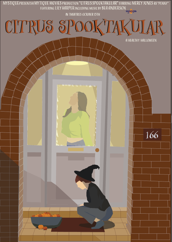 My 3 animated movie poster designs have been created through illustrator and are all unique. All three I have made to follow my brand with the art style and the colour. All of my characters I have designed to have no face to keep it ambiguous and vague. This design will mean the children will be able to identify and relate to any character which will be inspiring. “In order to appeal to fans of the horror genre, designers commonly utilize dark colors such as black, gray, red, and purple, as well as negative space, which creates suspenseful compositions that leave certain elements up to the viewer’s imagination” (Tribu, N.D). Although of course I am appealing to a family demographic, I still utilised this idea of artfully placing darker colours to symbolise a more Halloween ambience. The atmosphere in all 3 movies was dictated by me with purple and orange hues to connote a spooky theme however not too scary as it for a family. My first poster, ‘Citrus Spooktakular’ was created to be an movie poster about trick or treating but of course the candy has become oranges. I drew this on illustrator from reference pictures I took. I used different colour composition tactics to emphasise shadows. My secondary poster, ‘Pumpkin Palace’ was created as an outdoor scene that shows a pumpkin house in the forest where a witch lives. I chose shades of purple and orange to signify a Halloween motif. “Pumpkins in horror don’t just signify that it’s Halloween; they convey the feeling that something dark yet playful is going on” (Octoberverse, 2023). The use of pumpkins is done purposefully to emphasise the brand and Halloween ambience. I intended to create a connection between my posters and Halloween therefore it would draw in more viewers and potential fans. Whilst making this poster, my classmate inspired me to add shadows which gave the poster and artwork more dimension and character. My last poster is for, ‘Whimsical Woods’ was also created on illustrator. I used a picture of my dog to create the dog and an image of my friend to become the main character. The composition of the poster draws the viewers eyes to all aspects of the posters. For all 3 posters, I decided to use the same font for the title of the film, the font is whimsical and emphasises the fantasy aspect of children’s films which I of course would like to capture. “Fantasy Fonts can transport us to enchanted realms, evoke a sense of awe and wonder” (Markeefonts, 2023). I wanted to go beyond just the aesthetic and use the font in order to prepare the viewer for what they are going to see when they watch the film. For example, the fantasy element is clearly shown with the unusual, mythical font. This was important because children’s movies are stereotypically creative and I wanted to incorporate this into the typography, colour and overall poster. For all 3 posters I incorporated the ‘Mystique’ logo in order to connect the movies to the brand. “A powerful advertising tool, studios and producers use it to boost a film’s promotional allure by positioning high-profile names front and center” (Film/Art Gallery, 2023). I used a billing block on my poster to conform to movie poster stereotypes and it will also bring in movie literate fans whether that be parents of children or even just Halloween lovers.