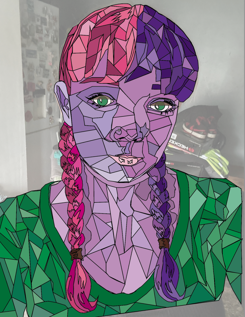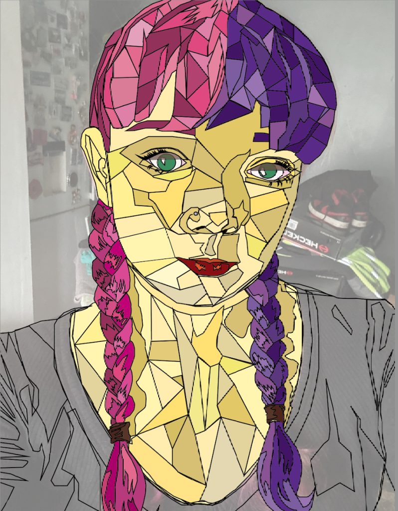 I decided to try out different colours for the stained glass portrait in order to find a suitable skin colour. Originally I wanted a more abstract colour so I decided to test a purple and a yellow. I ended choosing a more peach skin tone to make it more realistic as I didn’t want the portrait to be too abstract, especially as I was taking my interest from Marc Chagall. Through choosing a more realistic skin tone it made the background pop out as well as the vibrant choice of hair and clothes colouring.