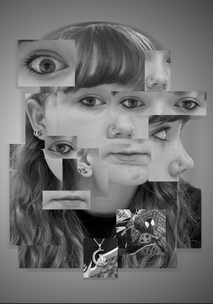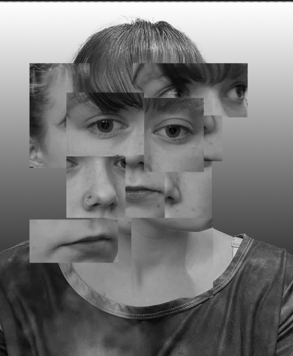 This was my original test for my surrealism portrait. I tested out the shapes and placement for different features and then I recreated it on different pictures as seen below. With my finished portrait I decided to go further to make it a more surrealist image by incorporating more images and boxes. This is an amalgamation of many different images of myself but altogether it is a cohesive portrait.