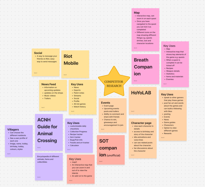 The competitor research I did showed that many different apps have similar features such as communication with other players, news and an event checklist. I plan to adopt a few of these ideas.