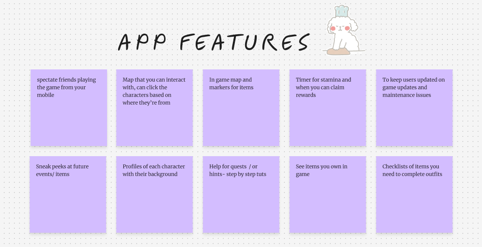 The key uses of this app will be to keep up to date with friends, accessing an easy to understand calendar and being able to access news and upcoming updates. Here are my initial ideas for my app. The features i find most useful are the ability to see when there is maintenance issues or a game update as it can show the user the times which they can’t play in a much quicker form that trying to load the game. Furthermore the friends list and ability to message friends is useful as users can speak to their in game friends and plan items to play together etc. Finally, the calendar will be an easy interactive way for users to see upcoming events within the game. Originally, I chose to have an upload post interaction for this game however, to avoid frustrations such as bullying, I’ve decided to remove this feature.