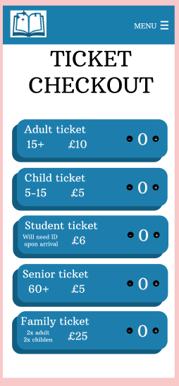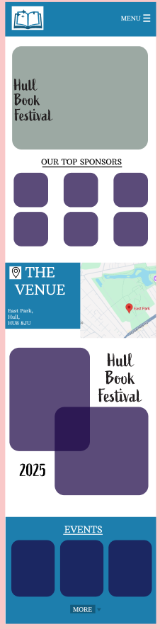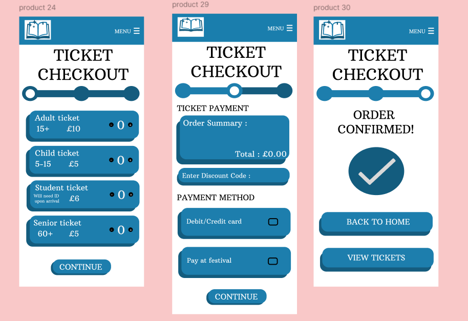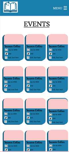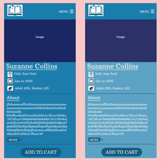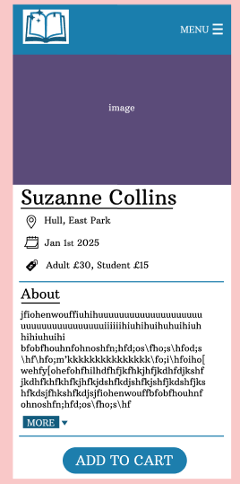 The events pages are important as they prepare the user for the contents of the festival as well as each event being purchased individually. The easy-to-understand layout is done to support my users as my user journey map showed that my audience have a variety of different genres and styles of authors/books that they prefer therefore these events pages are easy to differentiate allowing each user to choose what fits their needs.