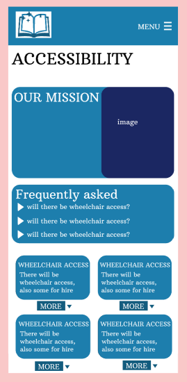 My homepage is a long page which users can scroll through, and it has images to adhere to the ‘Aesthetic-usability’ design law as the images will make my app aesthetically pleasing and engaging. It has easy ways to navigate to each page for example the small events section that can be used to access the events page. This easy navigation will make my app accessible for everyone using it. Furthermore, the fonts on my home page are large and easily readable. The use of the map on the homepage will instantly inform the user where the venue will be.