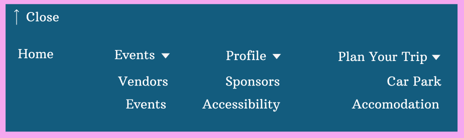 The main difference between my app and website is the menu pop up. The website menu is instead a more conventional style of a pull-down menu. I have applied the condensed version on each page and it will be easily accessible as it is clear on the top of each page. It has different key parts of the website such as events, trip planning and sponsors. Each user will be able to understand this as it is familiar but also unique due to the design and colour palette. The menu bar at the top of each page contains the logo as well as the name of the festival in the logo font. This paired with the menu bar is a conventional header for a website.