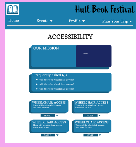In order to adapt my app design to a website I had to recreate the original design in Figma. I had to make sure to leave white space at either side of the desktop to avoid business or an overstimulating page. As a means to build a brand identity, I continued to employ the blue colour scheme throughout my website design. This also benefits my user as through my primary research many of my users chose blue as an identifiable colour for a book festival. Furthermore, I continued with the bubbly aesthetic and layered art style I had chosen. This design gave the website dimension, and the layered shades of blue complemented each other which made it overall an aesthetically pleasing design that mirrored the app version.