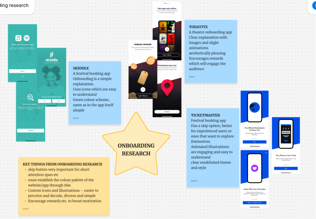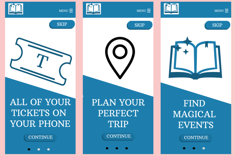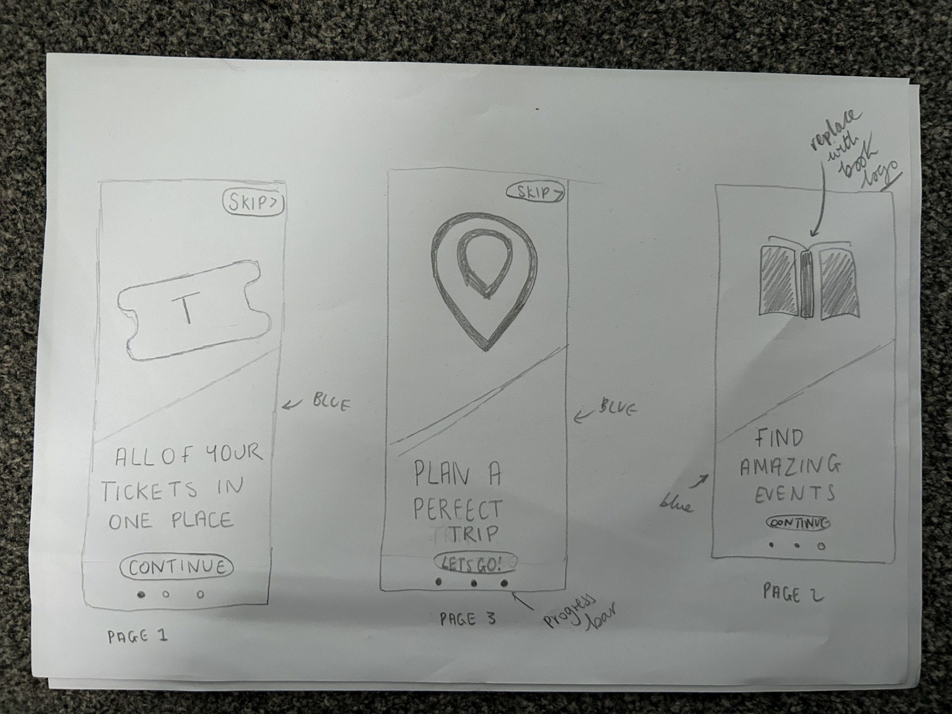 To create my onboarding I started with different sketches. I decided to follow a theme which all 3 pages included an icon/image. I did this in order to engage my users as they are easy to understand. The icons are easy to create and follow my colour scheme. The final icon is my logo which further reinforces my brand. The onboarding process I have created on Figma includes a progress bar. This was necessary as the user will know how many steps there are and how close they are to the end. This will motivate the user to continue and finish the process before viewing the app. Alternatively, the user has the option to use the skip button and go straight to the app. This is useful for users who already have experience with this app (or similar apps) and it also is useful for users with short attention spans that potentially are tech savvy and confident in their ability to use the app. The ability to skip gives the users control and this is vital in an onboarding system. Furthermore, I heavily used the blue colour palette in order to establish my brand. Through my onboarding research, I quickly concluded that the onboarding process must reflect the atmosphere of the app and I ensured this through the house style. Finally the continue and skip buttons both conform to my theme and the same style of button is used throughout my app.