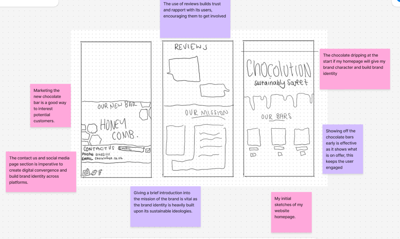 Before starting with my low-fidelity design, I did some rough pencil sketches as well as sketching on my iPad. I decided on a rough layout that honours conventionality to bring familiarity to a user. This familiarity, paired with the unique chocolate brand will be memorable and engaging for a user. Main parts I wanted to include in my design are reviews, our mission, a main banner and the chocolate bars themselves. In my initial design I focused on getting all the key components of a website homepage, especially the contact us page with hyperlinks to social media. This digital convergence is key to having a successful brand as being able to reach the social media from the website is vital. “A company’s website and social media channels are two fundamental pillars that significantly contribute to its visibility, credibility, and customer engagement” (Figure 1). This is why I will focus on having this as increasing the brand awareness and reach it can achieve is imperative for being successful.