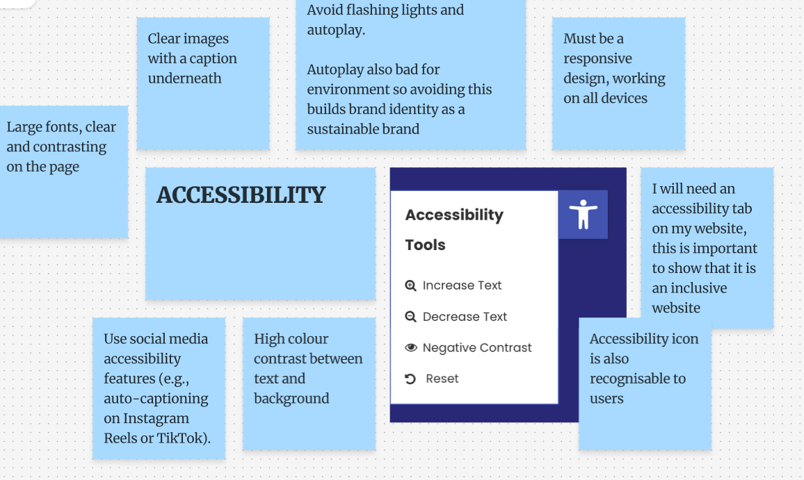 Finally, I have put a great emphasis on accessibility throughout my design. I have included an accessibility icon on my website as this is crucial in allowing all users to engage with the website. This icon would have been expandable allowing for larger fonts and dark mode. This is important as “Digital accessibility strives for inclusive design that allows anyone to use, engage, and enjoy digital content regardless of the level of ability, condition, or circumstances. It focuses on eliminating barriers that can block a user’s access to digital content” (Figure 3). Removing barriers that would have otherwise limited users is imperative in order to be a strong brand. Utilising easy adaptations such as a bold font, contrasting colours and using an accessibility tab is crucial to be inclusive for all audiences. This also opens the brand to a wider, more diverse audience.