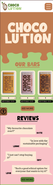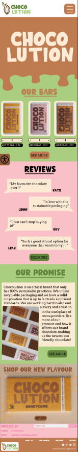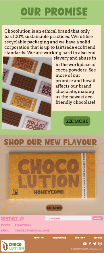 This is my mid fidelity design; I have utilised my colour palette throughout this website in order to make my website recognisable and build brand identity. The colours all complement each other, and the website is still accessible as there is a large contrast between colours. This accessibility is imperative to have a successful brand and reach a wider audience. Furthermore, I also utilised tactics such as reviews which engage the audience and makes them trust the brand due to the personal connection with other users that are leaving reviews. Finally, the emphasis of the ‘Our promise’ section makes it clear the brand ideology of ‘Chocolution’, and this is very important as most of the users will be eco-conscious therefore, they will steer towards brand that have sustainable methods.